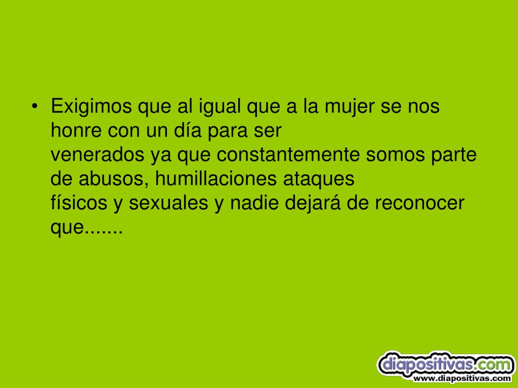 Exigimos que al igual que a la mujer se nos honre con un día para servenerados ya que constantemente somos parte de abusos, humillaciones ataquesfísicos y sexuales y nadie dejará de reconocer que.......