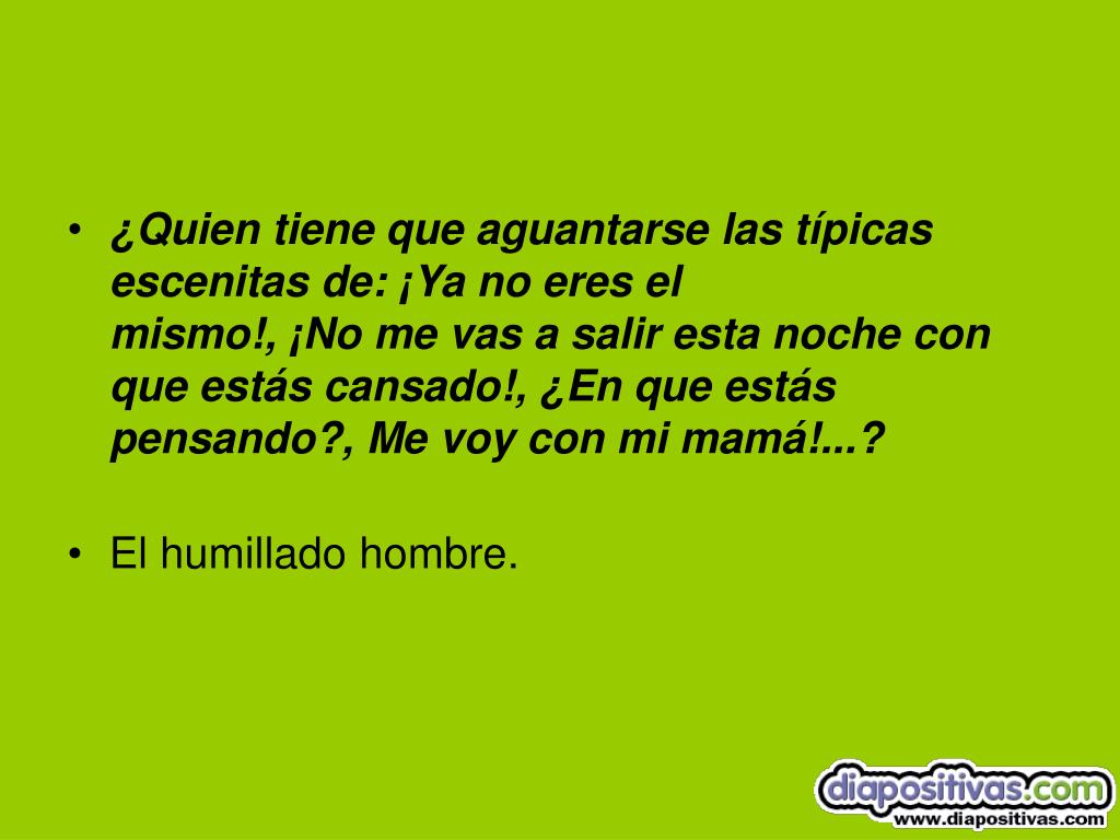 ¿Quien tiene que aguantarse las típicas escenitas de: ¡Ya no eres elmismo!, ¡No me vas a salir esta noche con que estás cansado!, ¿En que estás pensando?, Me voy con mi mamá!...? • El humillado hombre.