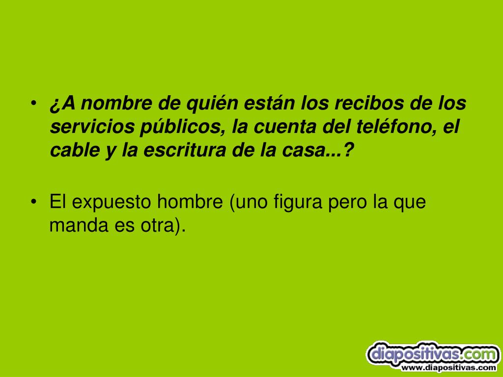 ¿A nombre de quién están los recibos de los servicios públicos, la cuenta del teléfono, el cable y la escritura de la casa...? • El expuesto hombre (uno figura pero la que manda es otra).