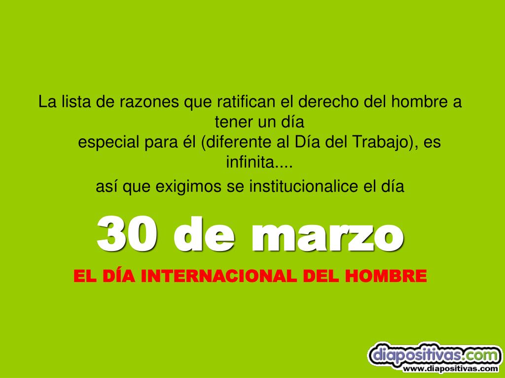 La lista de razones que ratifican el derecho del hombre a tener un díaespecial para él (diferente al Día del Trabajo), es infinita.... así que exigimos se institucionalice el día 30 de marzo EL DÍA INTERNACIONAL DEL HOMBRE