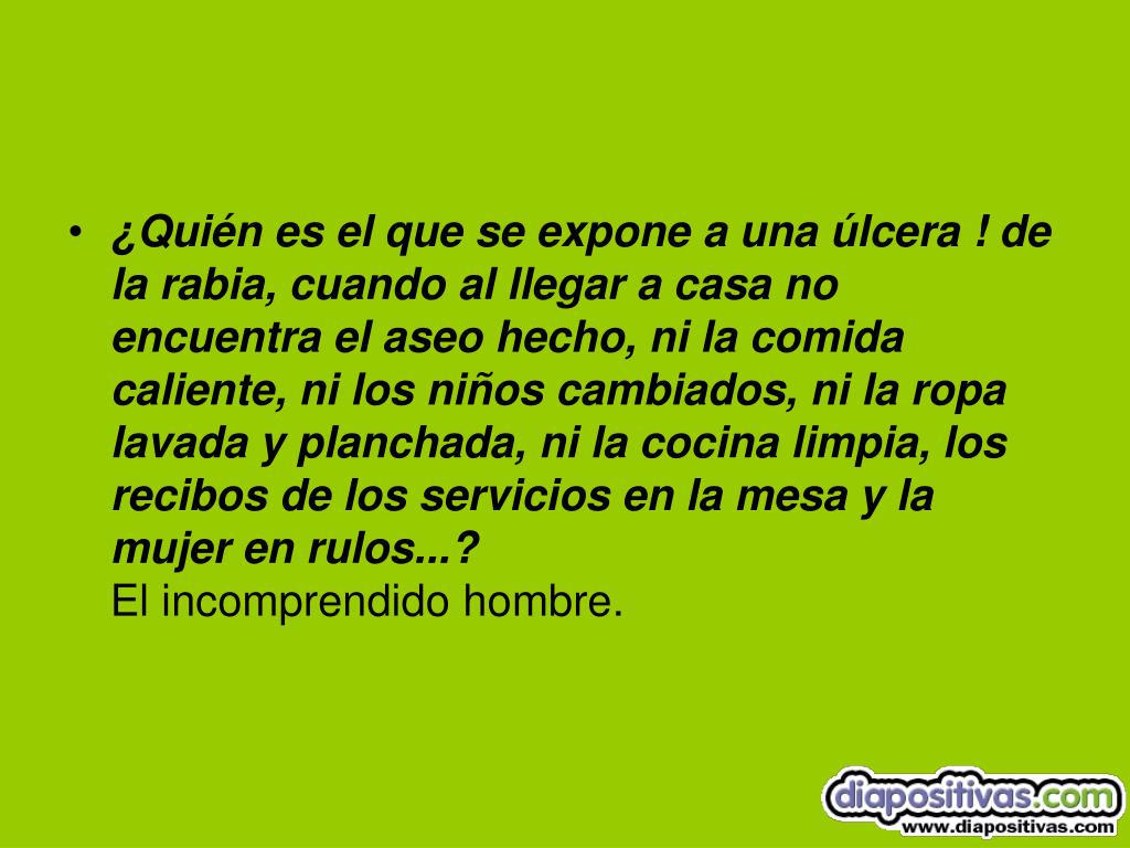 ¿Quién es el que se expone a una úlcera ! de la rabia, cuando al llegar a casa no encuentra el aseo hecho, ni la comida caliente, ni los niños cambiados, ni la ropa lavada y planchada, ni la cocina limpia, los recibos de los servicios en la mesa y la mujer en rulos...?El incomprendido hombre.