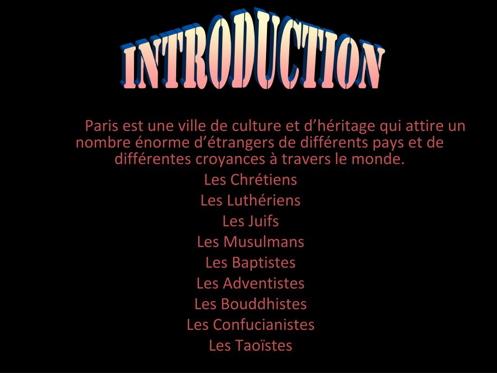 Introduction Paris est une ville de culture et d’héritage qui attire un nombre énorme d’étrangers de différents pays et de différentes croyances à travers le monde. Les Chrétiens Les Luthériens Les Juifs Les Musulmans Les Baptistes Les Adventistes Les Bouddhistes Les Confucianistes Les Taoïstes