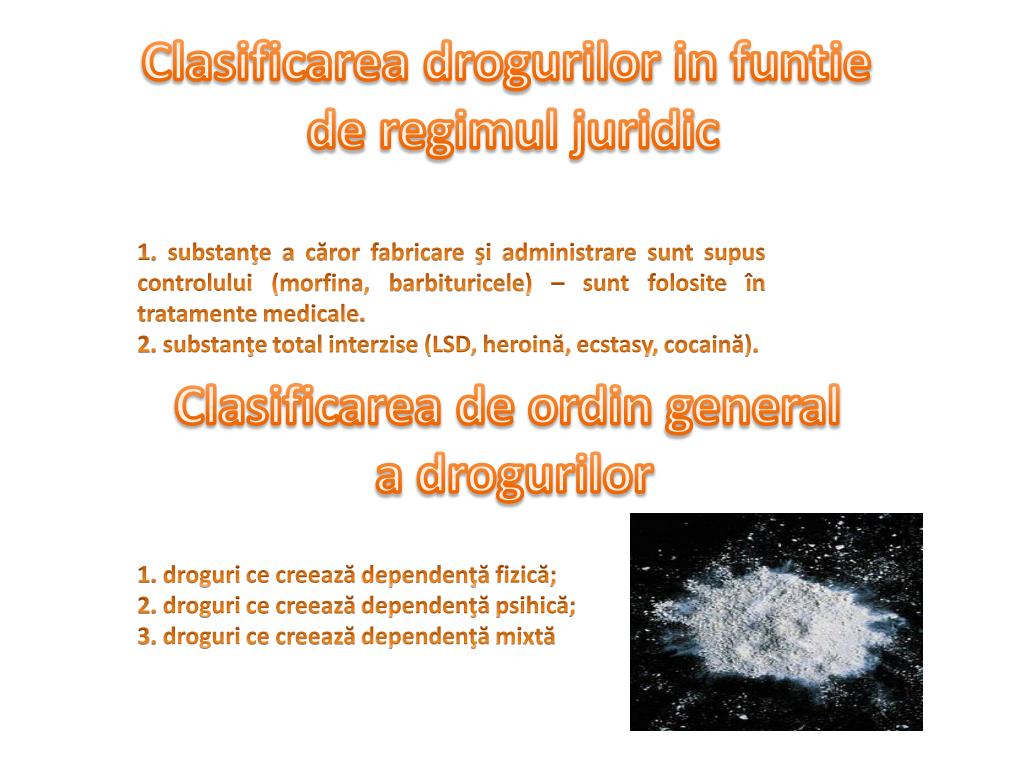 Clasificareadrogurilor in funtie de regimuljuridic 1. substanţe a căror fabricare şi administrare sunt supuscontrolului (morfina, barbituricele) – sunt folosite în tratamente medicale. 2. substanţe totalinterzise (LSD, heroină, ecstasy, cocaină). Clasificarea de ordin general a drogurilor 1. droguri ce creează dependenţă fizică; 2. droguri ce creează dependenţă psihică; 3. droguri ce creează dependenţă mixtă