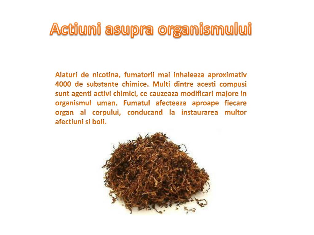 Actiuniasupraorganismului Alaturi de nicotina, fumatorii mai inhaleaza aproximativ 4000 de substante chimice. Multi dintre acesti compusi sunt agenti activi chimici, ce cauzeaza modificari majore in organismul uman. Fumatul afecteaza aproape fiecare organ al corpului, conducand la instaurarea multor afectiuni si boli.