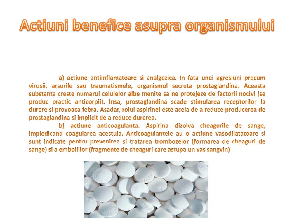 Actiuni benefice asupraorganismului a) actiune antiinflamatoare si analgezica. In fata unei agresiuni precum virusii, arsurile sau traumatismele, organismul secreta prostaglandina. Aceasta substanta creste numarul celulelor albe menite sa ne protejeze de factorii nocivi (se produc practic anticorpii). Insa, prostaglandina scade stimularea receptorilor la durere si provoaca febra. Asadar, rolul aspirinei este acela de a reduce producerea de prostaglandina si implicit de a reduce durerea. b) actiuneanticoagulanta. Aspirinadizolvacheagurile de sange, impiedicandcoagulareaacestuia. Anticoagulantele au o actiunevasodilatatoaresisunt indicate pentruprevenireasitratareatrombozelor (formarea de cheaguri de sange) si a emboliilor (fragmente de cheaguri care astupa un vas sangvin)