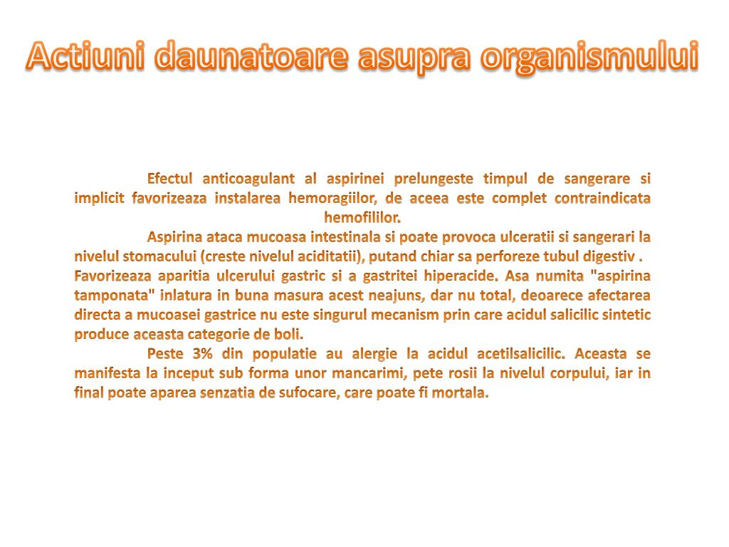 Actiunidaunatoareasupraorganismului Efectul anticoagulant al aspirinei prelungeste timpul de sangerare si implicit favorizeaza instalarea hemoragiilor, de aceea este complet contraindicata hemofililor.Aspirina ataca mucoasa intestinala si poate provoca ulceratii si sangerari la nivelul stomacului (creste nivelul aciditatii), putand chiar sa perforeze tubul digestiv . Favorizeazaaparitiaulcerului gastric si a gastriteihiperacide. Asanumita "aspirinatamponata" inlatura in bunamasuraacestneajuns, dar nu total, deoareceafectareadirecta a mucoaseigastrice nu estesingurulmecanismprin care acidulsalicilicsintetic produce aceastacategorie de boli. Peste 3% din populatie au alergie la acidul acetilsalicilic. Aceasta se manifesta la inceput sub forma unor mancarimi, pete rosii la nivelul corpului, iar in final poate apareasenzatia de sufocare, care poate fi mortala.