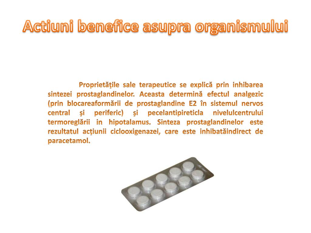 Actiuni benefice asupraorganismului Proprietăţile sale terapeutice se explică prin inhibarea sintezei prostaglandinelor. Aceasta determină efectul analgezic (prin blocareaformării de prostaglandine E2 în sistemul nervos central şi periferic) şi pecelantipireticlanivelulcentruluitermoreglăriiinhipotalamus. Sinteza prostaglandinelor este rezultatul acţiunii ciclooxigenazei, care este inhibatăindirect de paracetamol.