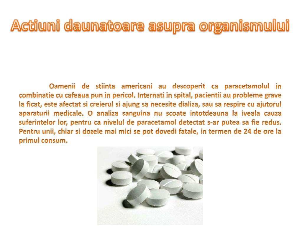 Actiunidaunatoareasupraorganismului Oameniide stiintaamericani au descoperitcaparacetamolul in combinatie cu cafeaua pun in pericol. Internati in spital, pacientii au probleme grave la ficat, esteafectatsicreierulsiajungsanecesitedializa, sausa respire cu ajutorulaparaturiimedicale. O analizasanguina nu scoateintotdeauna la ivealacauzasuferintelorlor, pentrucanivelul de paracetamoldetectat s-arputeasa fie redus. Pentruunii, chiarsidozelemaimici se pot dovedi fatale, in termen de 24 de ore la primulconsum.