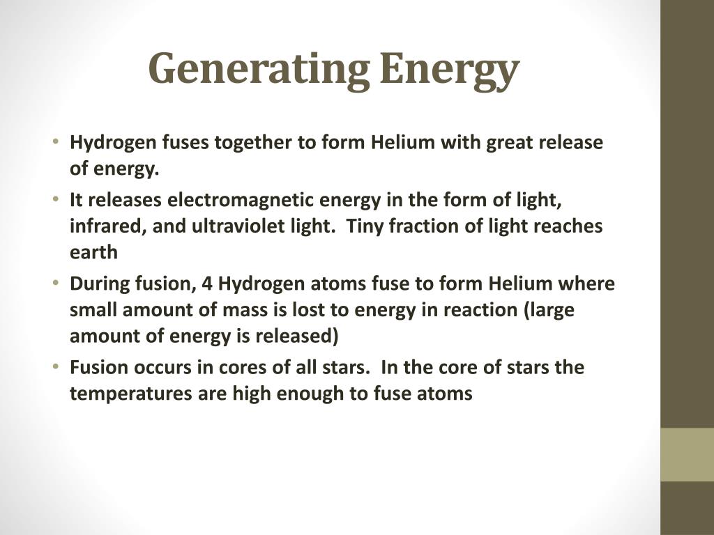 Generating Energy • Hydrogen fuses together to form Helium with great release of energy. • It releases electromagnetic energy in the form of light, infrared, and ultraviolet light. Tiny fraction of light reaches earth • During fusion, 4 Hydrogen atoms fuse to form Helium where small amount of mass is lost to energy in reaction (large amount of energy is released) • Fusion occurs in cores of all stars. In the core of stars the temperatures are high enough to fuse atoms