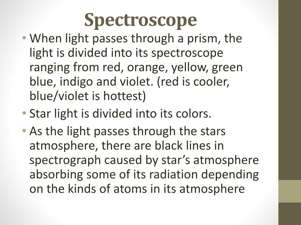 Spectroscope • When light passes through a prism, the light is divided into its spectroscope ranging from red, orange, yellow, green blue, indigo and violet. (red is cooler, blue/violet is hottest) • Star light is divided into its colors. • As the light passes through the stars atmosphere, there are black lines in spectrograph caused by star’s atmosphere absorbing some of its radiation depending on the kinds of atoms in its atmosphere