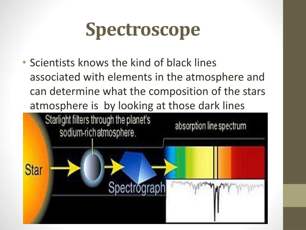 Spectroscope • Scientists knows the kind of black lines associated with elements in the atmosphere and can determine what the composition of the stars atmosphere is by looking at those dark lines