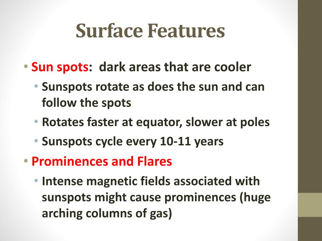 Surface Features • Sun spots: dark areas that are cooler • Sunspots rotate as does the sun and can follow the spots • Rotates faster at equator, slower at poles • Sunspots cycle every 10-11 years • Prominences and Flares • Intense magnetic fields associated with sunspots might cause prominences (huge arching columns of gas)