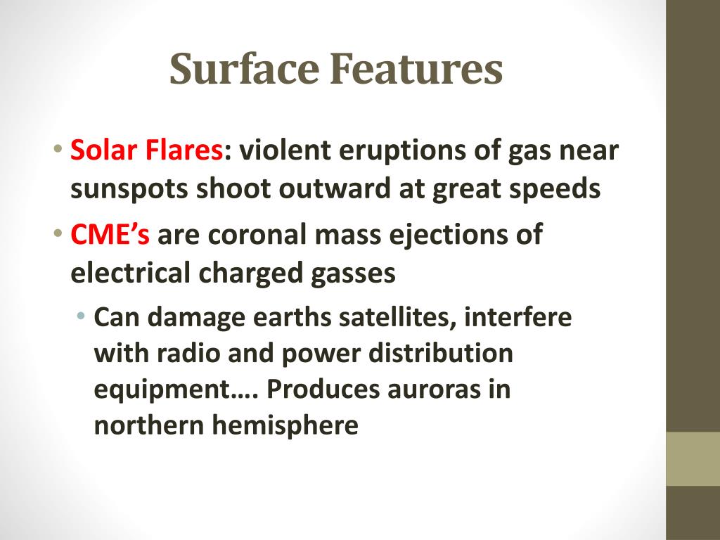 Surface Features • Solar Flares: violent eruptions of gas near sunspots shoot outward at great speeds • CME’s are coronal mass ejections of electrical charged gasses • Can damage earths satellites, interfere with radio and power distribution equipment…. Produces auroras in northern hemisphere