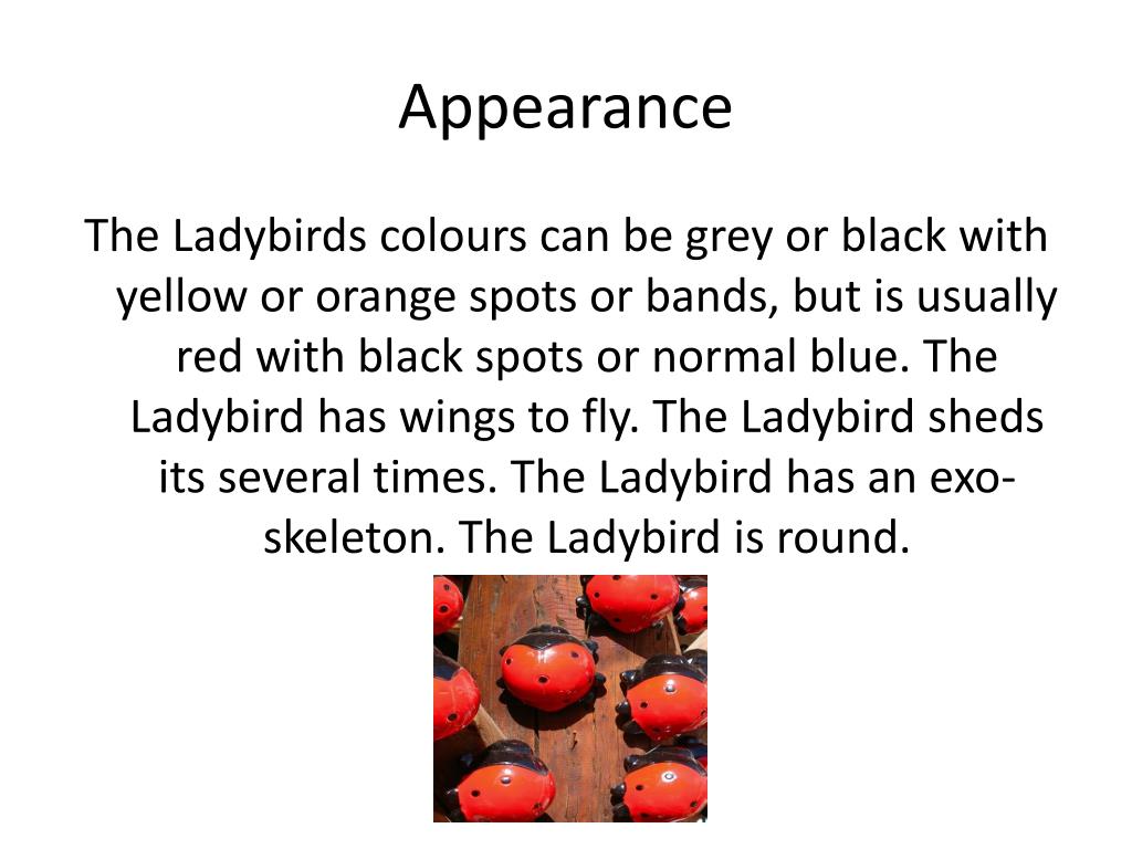 Appearance The Ladybirds colours can be grey or black with yellow or orange spots or bands, but is usually red with black spots or normal blue. The Ladybird has wings to fly. The Ladybird sheds its several times. The Ladybird has an exo-skeleton. The Ladybird is round.