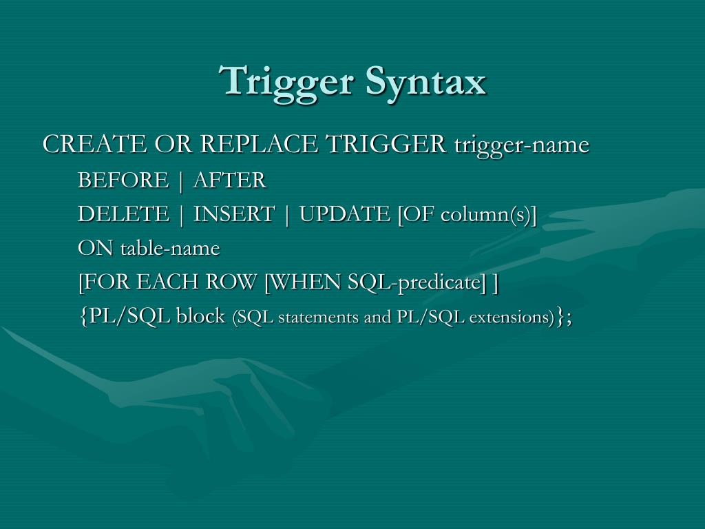 Trigger Syntax CREATE OR REPLACE TRIGGER trigger-name BEFORE | AFTER DELETE | INSERT | UPDATE [OF column(s)] ON table-name [FOR EACH ROW [WHEN SQL-predicate] ] {PL/SQL block (SQL statements and PL/SQL extensions)};