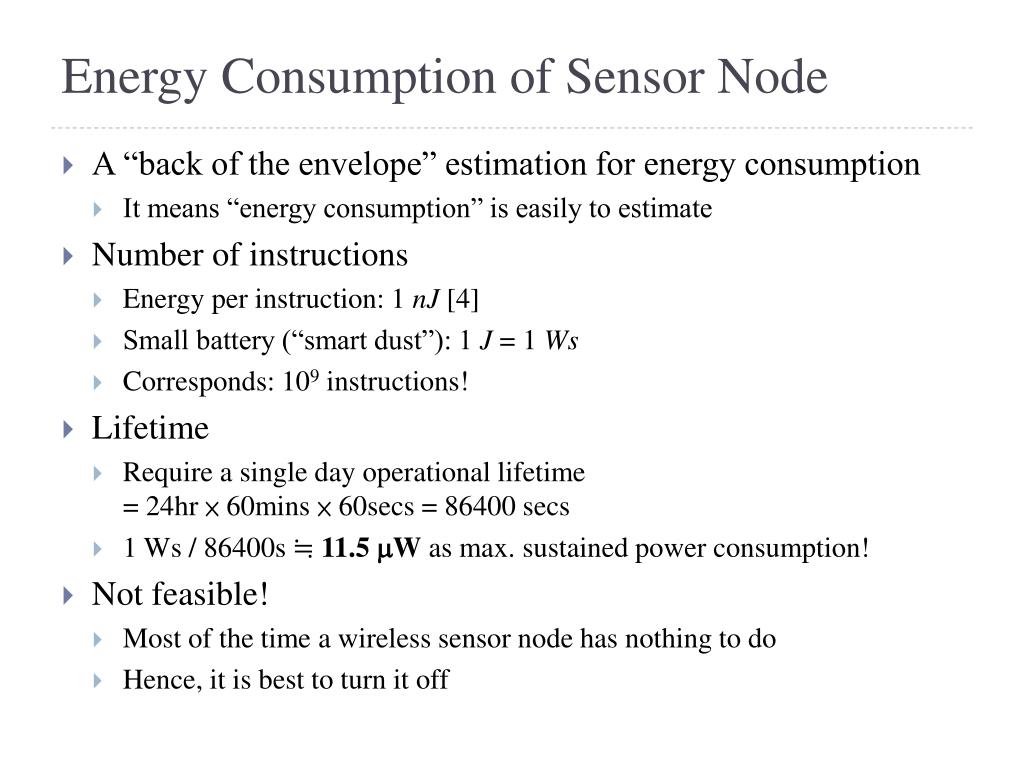 Energy Consumption of Sensor Node • A “back of the envelope” estimation for energy consumption • It means “energy consumption” is easily to estimate • Number of instructions • Energy per instruction: 1 nJ [4] • Small battery (“smart dust”): 1 J = 1 Ws • Corresponds: 109 instructions! • Lifetime • Require a single day operational lifetime = 24hr× 60mins × 60secs = 86400 secs • 1 Ws / 86400s ≒ 11.5 W as max. sustained power consumption! • Not feasible! • Most of the time a wireless sensor node has nothing to do • Hence, it is best to turn it off