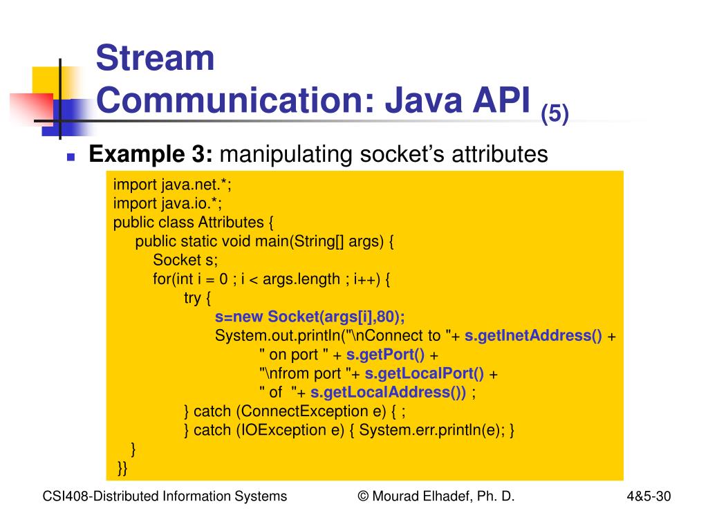 Stream Communication: Java API (5) • Example 3: manipulating socket’s attributes import java.net.*; import java.io.*; public class Attributes { public static void main(String[] args) { Socket s; for(int i = 0 ; i < args.length ; i++) { try { s=new Socket(args[i],80); System.out.println("\nConnect to "+ s.getInetAddress() + " on port " + s.getPort() + "\nfrom port "+ s.getLocalPort() + " of "+ s.getLocalAddress()) ; } catch (ConnectException e) { ; } catch (IOException e) { System.err.println(e); } } }} CSI408-Distributed Information Systems