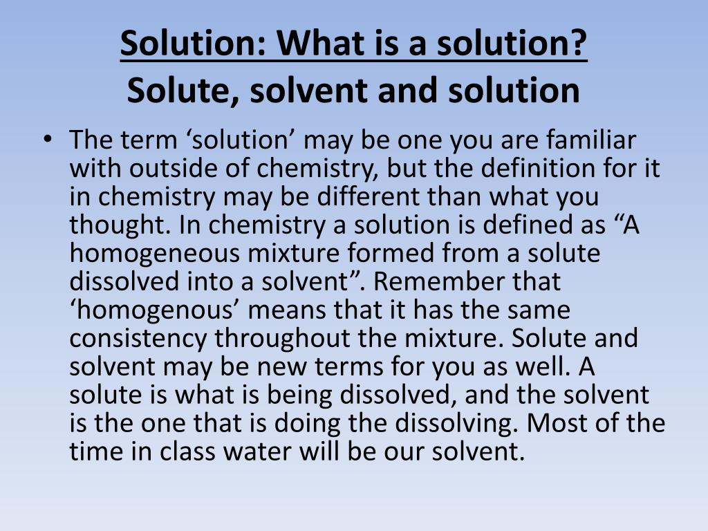 Solution: What is a solution? Solute, solvent and solution • The term ‘solution’ may be one you are familiar with outside of chemistry, but the definition for it in chemistry may be different than what you thought. In chemistry a solution is defined as “A homogeneous mixture formed from a solute dissolved into a solvent”. Remember that ‘homogenous’ means that it has the same consistency throughout the mixture. Solute and solvent may be new terms for you as well. A solute is what is being dissolved, and the solvent is the one that is doing the dissolving. Most of the time in class water will be our solvent.