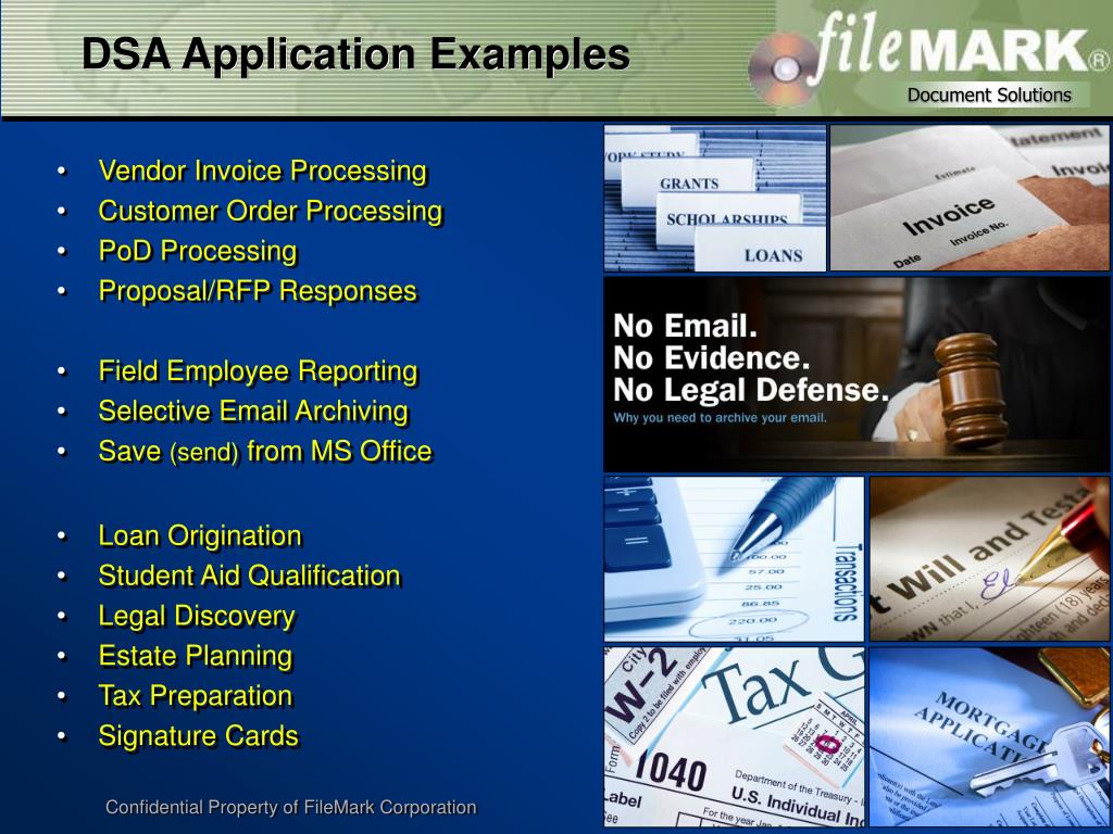 DSA Application Examples • Vendor Invoice Processing • Customer Order Processing • PoD Processing • Proposal/RFP Responses • Field Employee Reporting • Selective Email Archiving • Save (send) from MS Office • Loan Origination • Student Aid Qualification • Legal Discovery • Estate Planning • Tax Preparation • Signature Cards