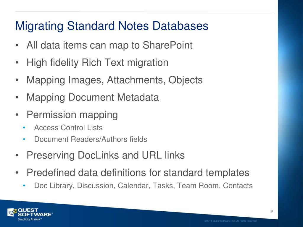 Migrating Standard Notes Databases • All data items can map to SharePoint • High fidelity Rich Text migration • Mapping Images, Attachments, Objects • Mapping Document Metadata • Permission mapping • Access Control Lists • Document Readers/Authors fields • Preserving DocLinks and URL links • Predefined data definitions for standard templates • Doc Library, Discussion, Calendar, Tasks, Team Room, Contacts