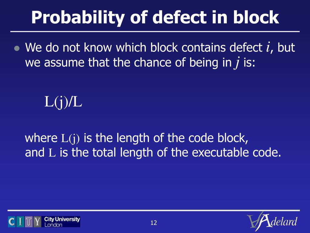 Probability of defect in block • We do not know which block contains defect i, but we assume that the chance of being in jis: L(j)/L where L(j) is the length of the code block, and L is the total length of the executable code.