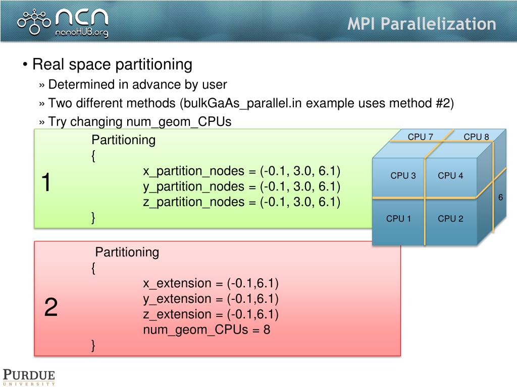MPI Parallelization • Real space partitioning • Determined in advance by user • Two different methods (bulkGaAs_parallel.in example uses method #2) • Try changing num_geom_CPUs • Partitioning • { • x_partition_nodes = (-0.1, 3.0, 6.1) y_partition_nodes = (-0.1, 3.0, 6.1) z_partition_nodes = (-0.1, 3.0, 6.1) • } CPU 7 CPU 8 1 CPU 3 CPU 4 6 CPU 1 CPU 2 • Partitioning • { • x_extension= (-0.1,6.1) • y_extension= (-0.1,6.1) • z_extension= (-0.1,6.1) • num_geom_CPUs= 8 • } 2