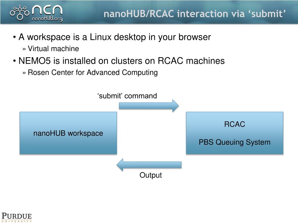 nanoHUB/RCAC interaction via ‘submit’ • A workspace is a Linux desktop in your browser • Virtual machine • NEMO5 is installed on clusters on RCAC machines • Rosen Center for Advanced Computing ‘submit’ command nanoHUB workspace RCAC PBS Queuing System Output