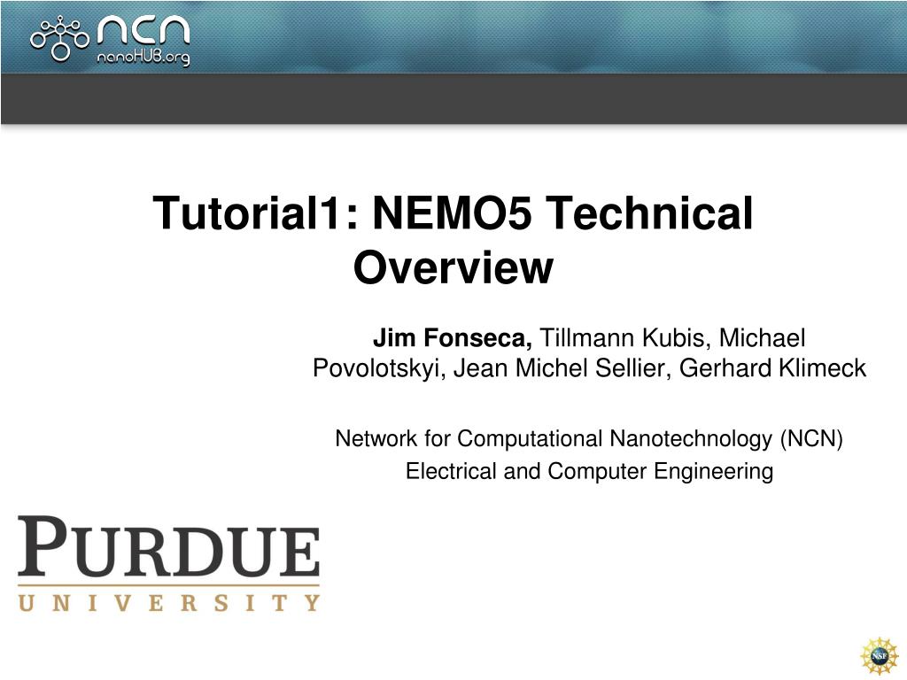 Tutorial1: NEMO5 Technical Overview. Jim Fonseca, Tillmann Kubis, Michael Povolotskyi, Jean Michel Sellier , Gerhard Klimeck Network for Computational Nanotechnology (NCN) Electrical and Computer Engineering. Overview. Licensing Getting NEMO5 Getting Help Documentation Compiling