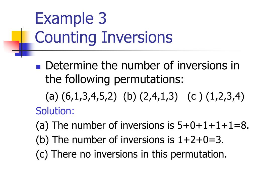 Example 3Counting Inversions • Determine the number of inversions in the following permutations: (a) (6,1,3,4,5,2) (b) (2,4,1,3) (c ) (1,2,3,4) Solution: (a) The number of inversions is 5+0+1+1+1=8. (b) The number of inversions is 1+2+0=3. (c) There no inversions in this permutation.