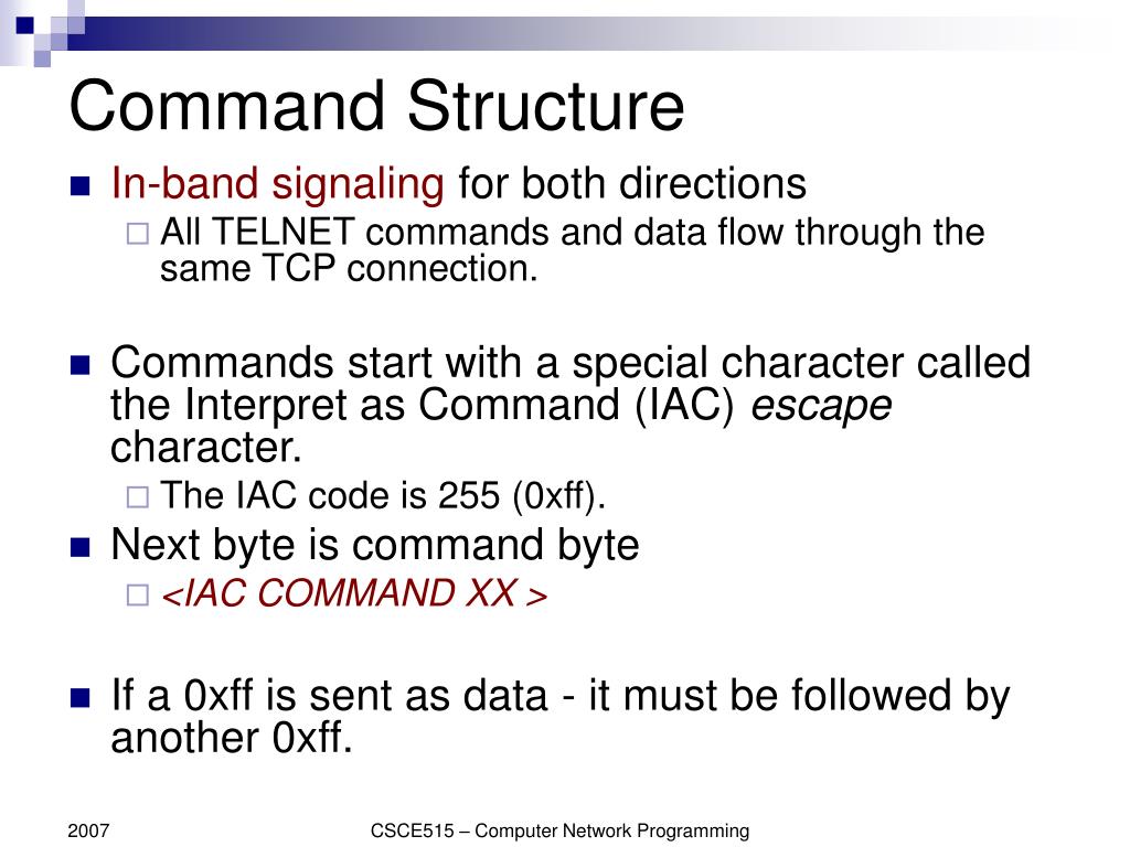 Command Structure • In-band signaling for both directions • All TELNET commands and data flow through the same TCP connection. • Commands start with a special character called the Interpret as Command (IAC) escape character. • The IAC code is 255 (0xff). • Next byte is command byte • <IAC COMMAND XX > • If a 0xff is sent as data - it must be followed by another 0xff. CSCE515 – Computer Network Programming