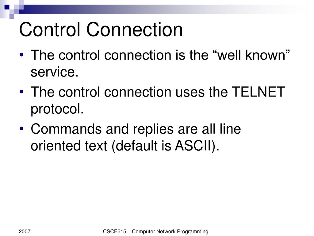 Control Connection • The control connection is the “well known” service. • The control connection uses the TELNET protocol. • Commands and replies are all line oriented text (default is ASCII). CSCE515 – Computer Network Programming