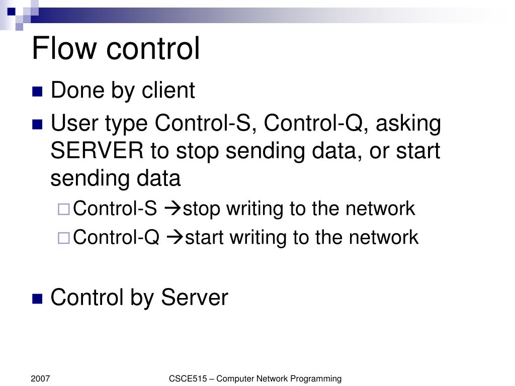 Flow control • Done by client • User type Control-S, Control-Q, asking SERVER to stop sending data, or start sending data • Control-S stop writing to the network • Control-Q start writing to the network • Control by Server CSCE515 – Computer Network Programming
