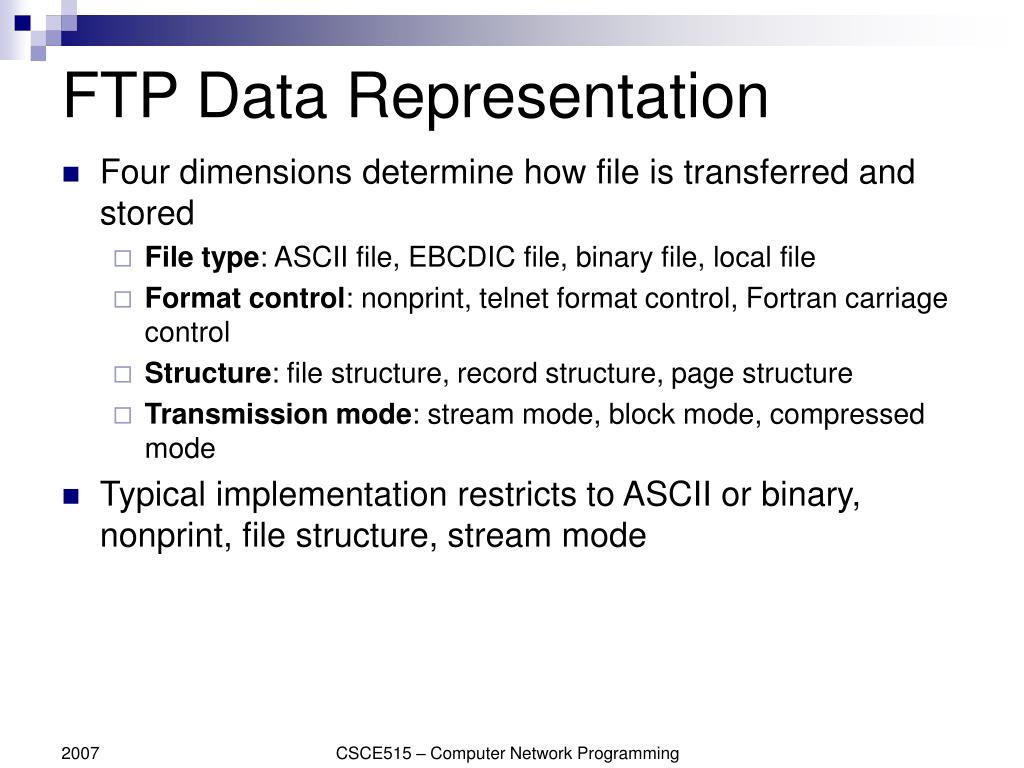 FTP Data Representation • Four dimensions determine how file is transferred and stored • File type: ASCII file, EBCDIC file, binary file, local file • Format control: nonprint, telnet format control, Fortran carriage control • Structure: file structure, record structure, page structure • Transmission mode: stream mode, block mode, compressed mode • Typical implementation restricts to ASCII or binary, nonprint, file structure, stream mode CSCE515 – Computer Network Programming