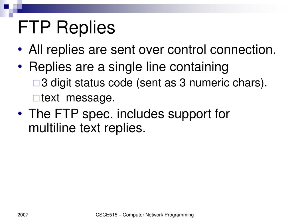 FTP Replies • All replies are sent over control connection. • Replies are a single line containing • 3 digit status code (sent as 3 numeric chars). • text message. • The FTP spec. includes support for multiline text replies. CSCE515 – Computer Network Programming