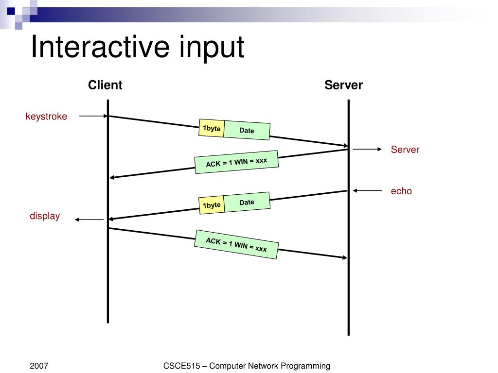 1byte 1byte Date Date ACK = 1 WIN = xxx Interactive input Client Server keystroke Server echo display ACK = 1 WIN = xxx CSCE515 – Computer Network Programming