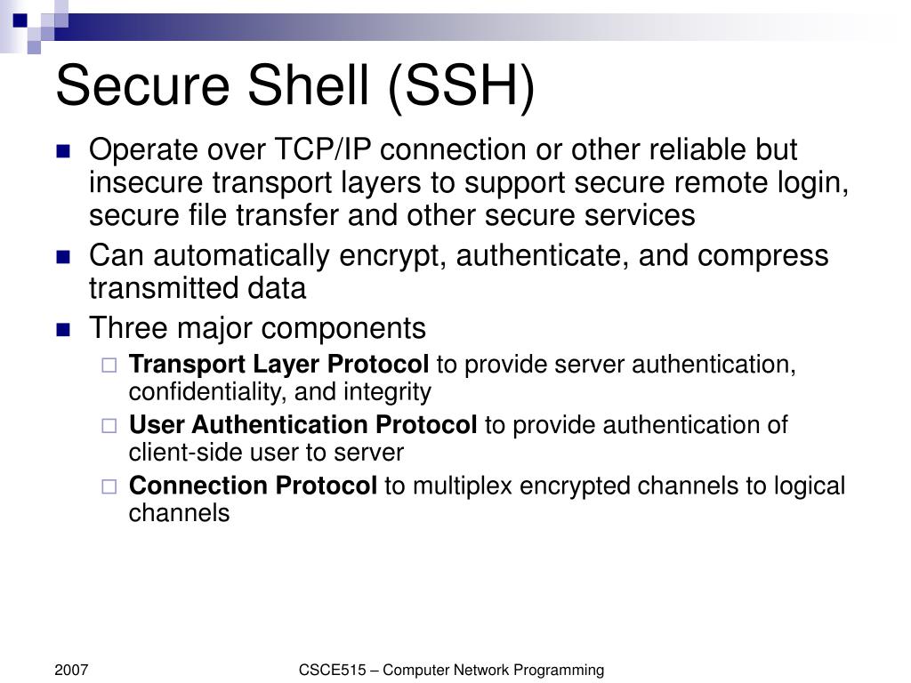 Secure Shell (SSH) • Operate over TCP/IP connection or other reliable but insecure transport layers to support secure remote login, secure file transfer and other secure services • Can automatically encrypt, authenticate, and compress transmitted data • Three major components • Transport Layer Protocol to provide server authentication, confidentiality, and integrity • User Authentication Protocol to provide authentication of client-side user to server • Connection Protocol to multiplex encrypted channels to logical channels CSCE515 – Computer Network Programming
