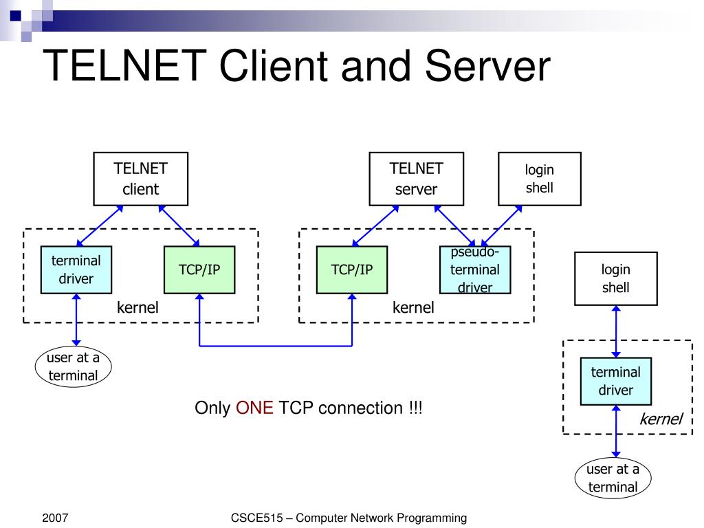 TELNET Client and Server TELNET client TELNET server login shell terminal driver TCP/IP TCP/IP pseudo- terminal driver login shell kernel kernel user at a terminal terminal driver Only ONE TCP connection !!! kernel user at a terminal CSCE515 – Computer Network Programming