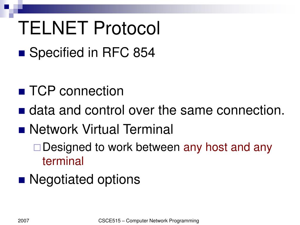 CSCE 515 : Computer Network Programming ------ Rlogin, Telnet, Ftp. Wenyuan Xu http://www.cse.sc.edu/~wyxu/csce515f07.html Department of Computer Science and Engineering University of South Carolina. TELNET vs. telnet.
