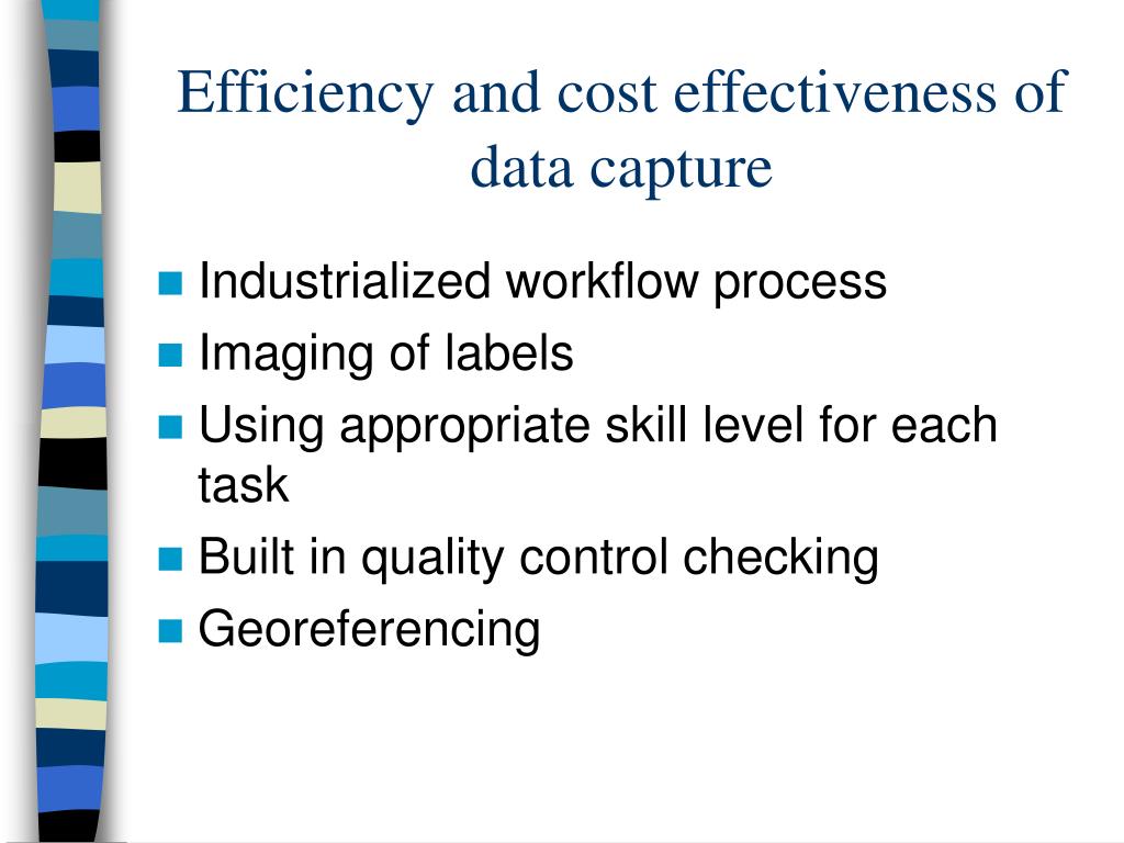 Efficiency and cost effectiveness of data capture • Industrialized workflow process • Imaging of labels • Using appropriate skill level for each task • Built in quality control checking • Georeferencing