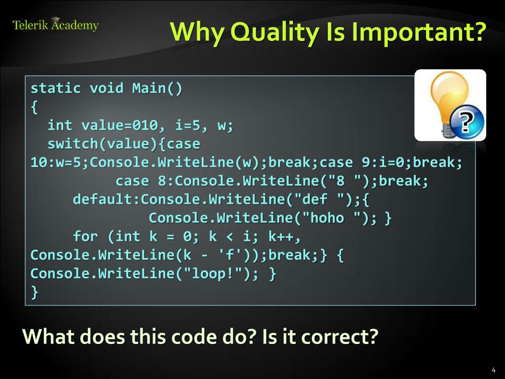 Why Quality Is Important? (2) Now the code is formatted, but is still unclear. static void Main() { int value = 010, i = 5, w; switch (value) { case 10: w = 5; Console.WriteLine(w); break; case 9: i = 0; break; case 8: Console.WriteLine("8 "); break; default: Console.WriteLine("def "); Console.WriteLine("hoho "); for (int k = 0; k < i; k++, Console.WriteLine(k - 'f')) ; break; } Console.WriteLine("loop!"); }