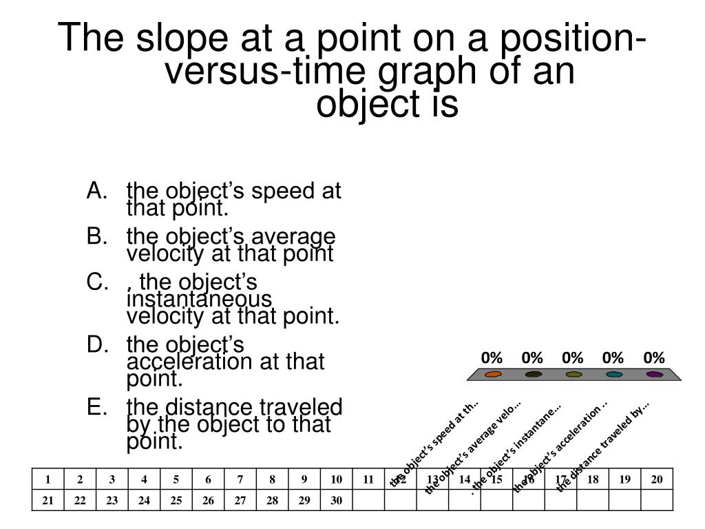 The slope at a point on a position-versus-time graph of an object is • the object’s speed at that point. • the object’s average velocity at that point • . the object’s instantaneous velocity at that point. • the object’s acceleration at that point. • the distance traveled by the object to that point.