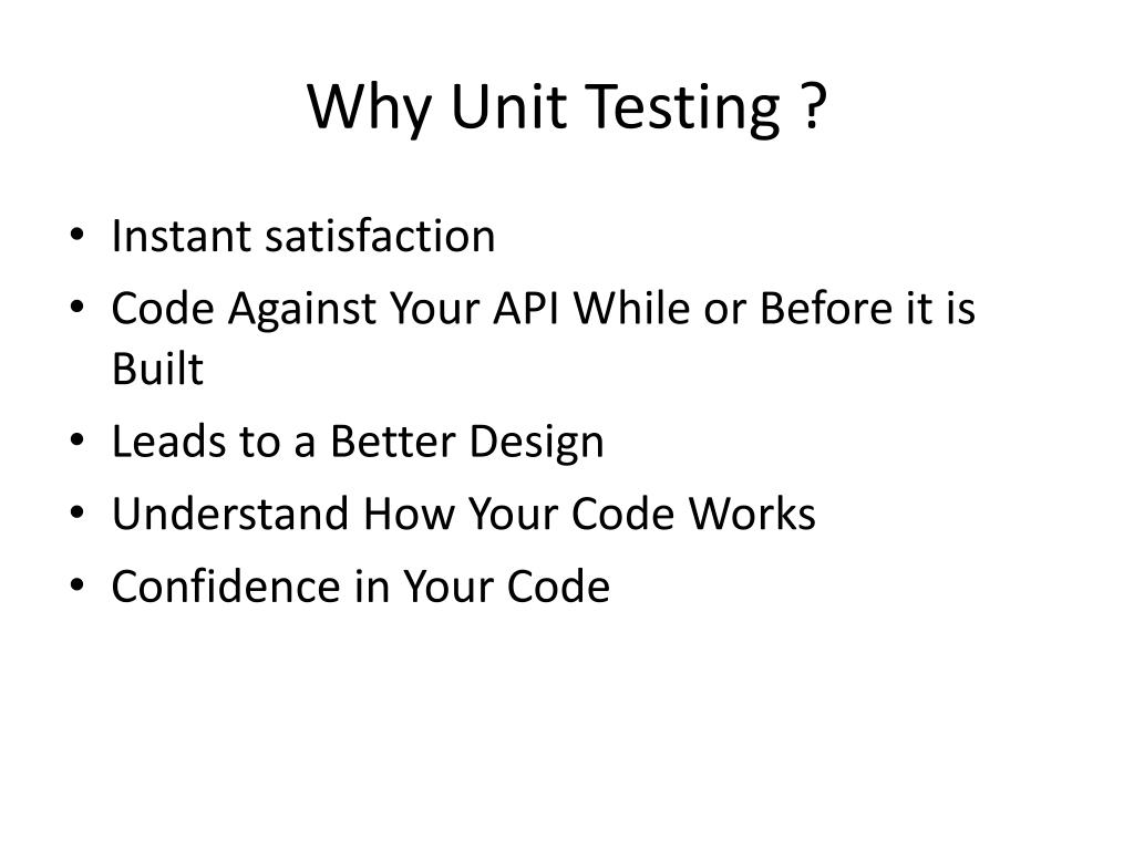 Why Unit Testing ? • Instant satisfaction • Code Against Your API While or Before it is Built • Leads to a Better Design • Understand How Your Code Works • Confidence in Your Code