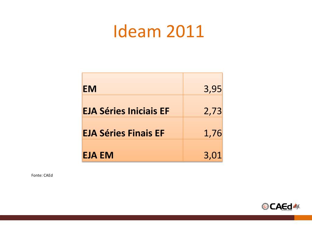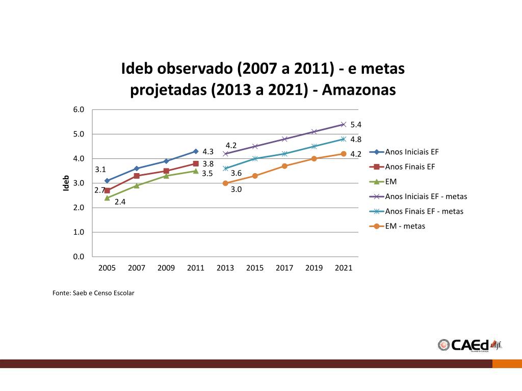 Ideam – Índice de desenvolvimento da Educação Básica do Amazonas • Foi instituído em 2011. • Leva em consideração testes de Língua Portuguesa, Matemática, Ciência Humanas e Ciências da Natureza das unidades de educação básica que participam do SADEAM (Sistema de Avaliação do Desempenho Educacional do Amazonas). • Calculado para o Ensino Regular e EJA e divulgado para o Ensino Médio (inclui outras disciplinas) e EJA (séries e etapas que não possuem resultados no Ideb).