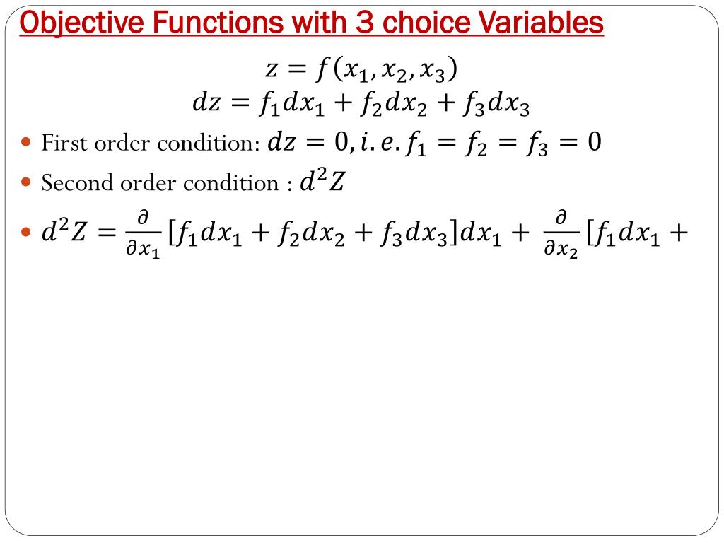 Objective Functions with 3 choice Variables • First order condition: • Second order condition :