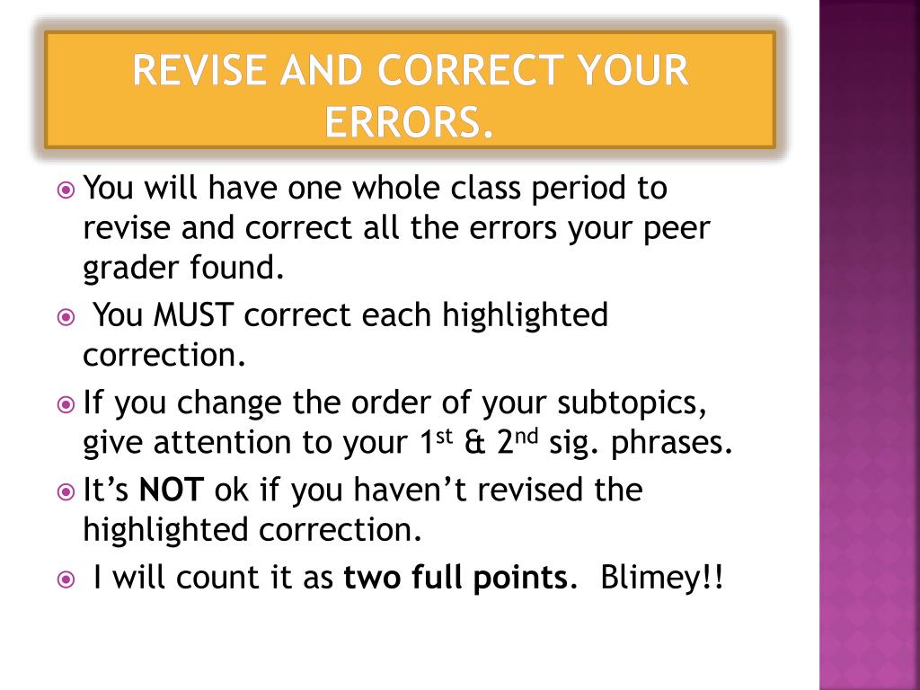 Revise and correct your errors. • You will have one whole class period to revise and correct all the errors your peer grader found. • You MUST correct each highlighted correction. • If you change the order of your subtopics, give attention to your 1st & 2nd sig. phrases. • It’s NOT ok if you haven’t revised the highlighted correction. • I will count it as two full points. Blimey!!