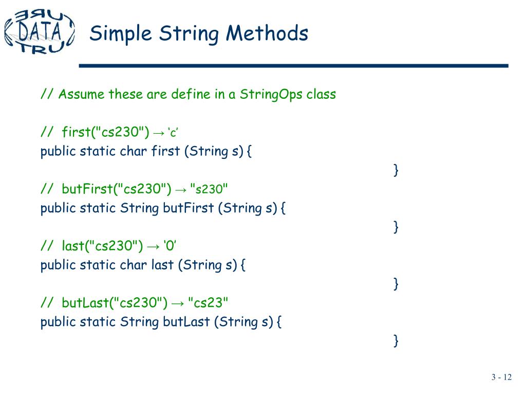 Simple String Methods // Assume these are define in a StringOps class // first("cs230") → ‘c’ public static char first (String s) { } // butFirst("cs230") → "s230" public static String butFirst (String s) { } // last("cs230") → ‘0’ public static char last (String s) { } // butLast("cs230") → "cs23" public static String butLast (String s) { }