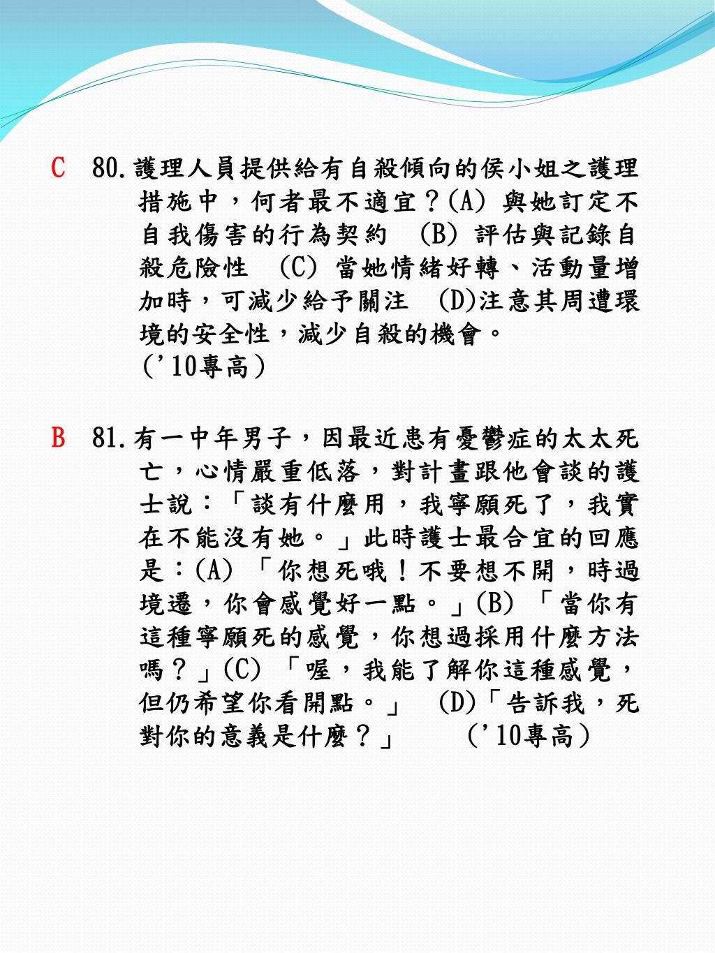 C80.護理人員提供給有自殺傾向的侯小姐之護理措施中,何者最不適宜?(A) 與她訂定不自我傷害的行為契約 (B) 評估與記錄自殺危險性 (C) 當她情緒好轉、活動量增加時,可減少給予關注 (D)注意其周遭環境的安全性,減少自殺的機會。 ('10專高) B81.有一中年男子,因最近患有憂鬱症的太太死亡,心情嚴重低落,對計畫跟他會談的護士說:「談有什麼用,我寧願死了,我實在不能沒有她。」此時護士最合宜的回應是:(A) 「你想死哦!不要想不開,時過境遷,你會感覺好一點。」(B) 「當你有這種寧願死的感覺,你想過採用什麼方法嗎?」(C) 「喔,我能了解你這種感覺,但仍希望你看開點。」 (D)「告訴我,死對你的意義是什麼?」 ('10專高)