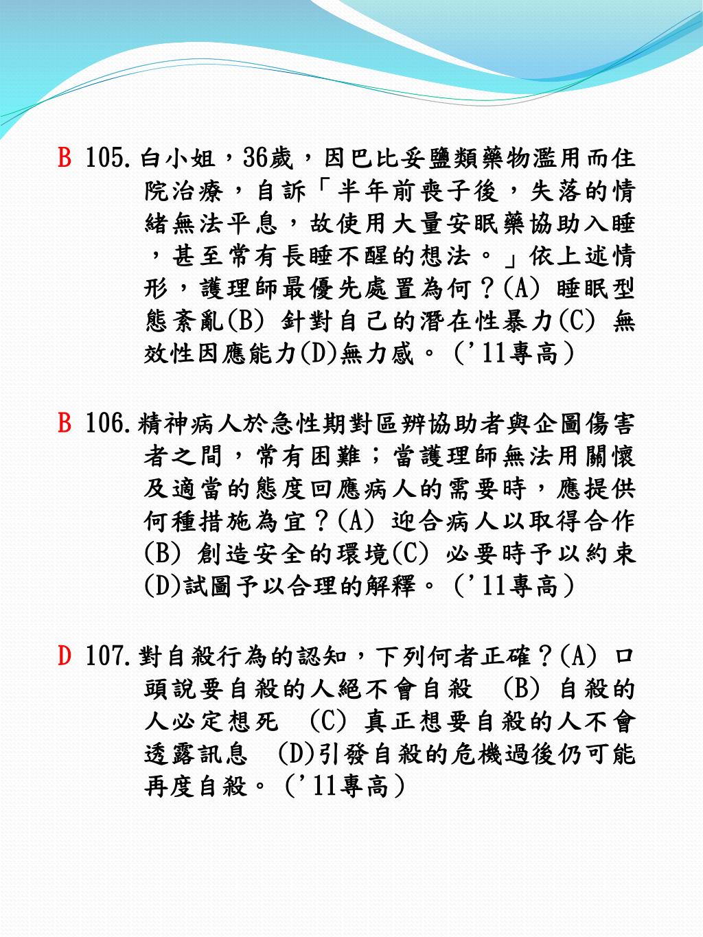 B105.白小姐,36歲,因巴比妥鹽類藥物濫用而住院治療,自訴「半年前喪子後,失落的情緒無法平息,故使用大量安眠藥協助入睡,甚至常有長睡不醒的想法。」依上述情形,護理師最優先處置為何?(A) 睡眠型態紊亂(B) 針對自己的潛在性暴力(C) 無效性因應能力(D)無力感。('11專高) B106.精神病人於急性期對區辨協助者與企圖傷害者之間,常有困難;當護理師無法用關懷及適當的態度回應病人的需要時,應提供何種措施為宜?(A) 迎合病人以取得合作(B) 創造安全的環境(C) 必要時予以約束(D)試圖予以合理的解釋。('11專高) D107.對自殺行為的認知,下列何者正確?(A) 口頭說要自殺的人絕不會自殺 (B) 自殺的人必定想死 (C) 真正想要自殺的人不會透露訊息 (D)引發自殺的危機過後仍可能再度自殺。('11專高)