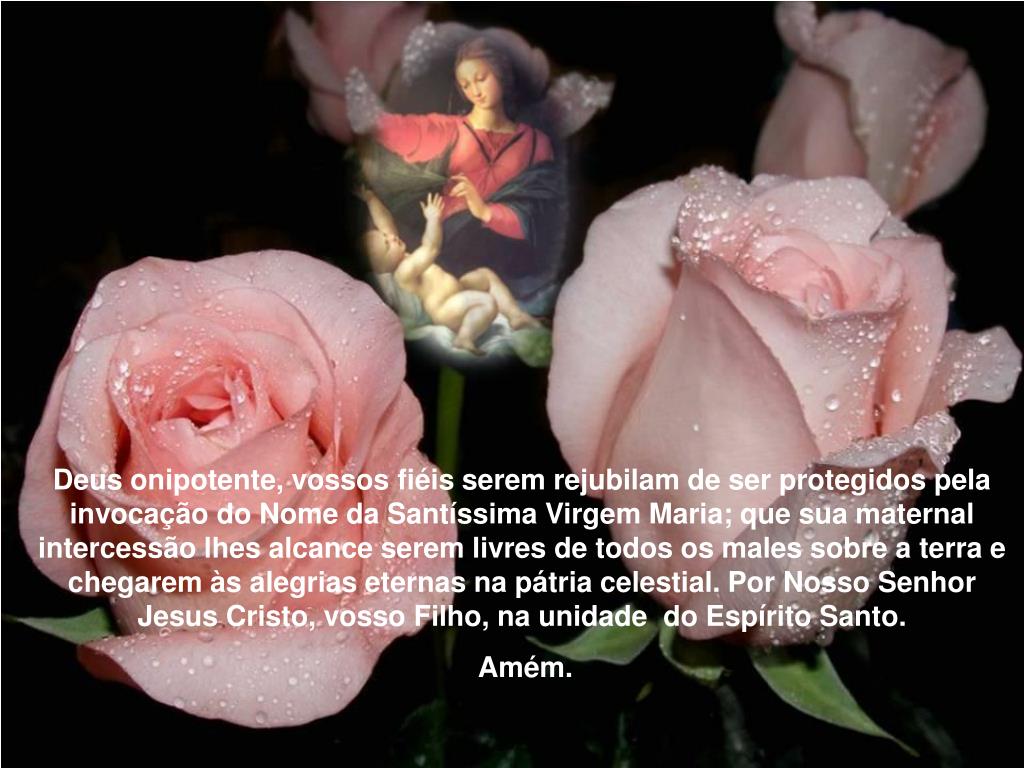 Deus onipotente, vossos fiéis serem rejubilam de ser protegidos pela invocação do Nome da Santíssima Virgem Maria; que sua maternal intercessão lhes alcance serem livres de todos os males sobre a terra e chegarem às alegrias eternas na pátria celestial. Por Nosso Senhor Jesus Cristo, vosso Filho, na unidade do Espírito Santo. Amém.