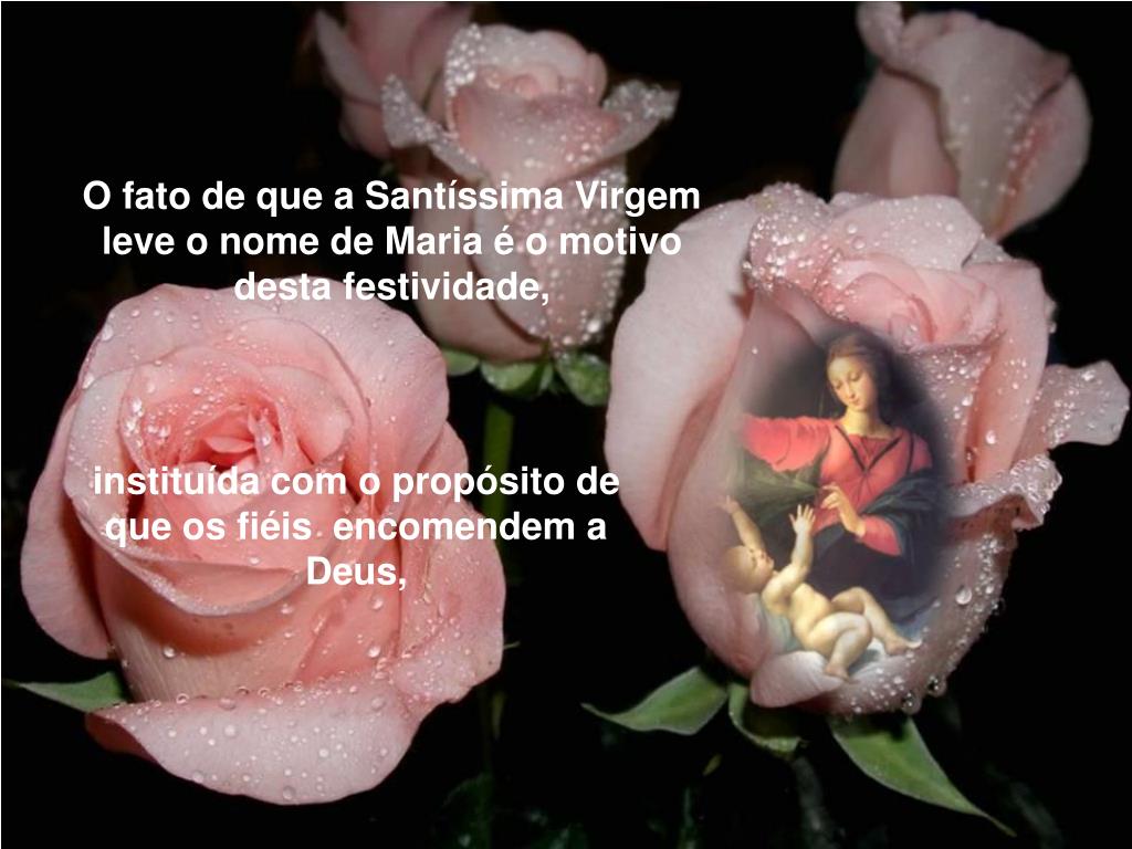 Festa do santo nome de Maria. 12 de setembro. O fato de que a Santíssima Virgem leve o nome de Maria é o motivo desta festividade,. instituída com o propósito de que os fiéis encomendem a Deus,. através da intercessão da Santa Mãe, as necessidades da Igreja,.